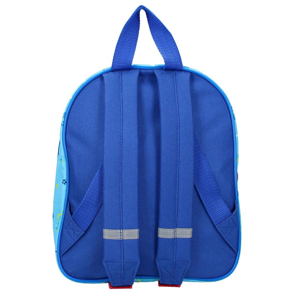Pret Ryggsäck Barn Chase The Fun! omfattar en blå barnryggsäck med dinosauriemotiv tillverkad av polyester som har två fack med blåa dragkedjor. Framfacket, som har en kant av ljusblått runt hela facket, är dekorerat med en bild av en neongrön dinosaurie som har på sig orange över-ear-hörlurar och njuter av musik mot en blå bakgrund med dinosaurie fotavtryck och stjärnor. Huvudfacket, som har en röd kant runt hela facket, är dekorerat med dinosaurier, stjärnor, dinosaurie fotavtryck och växter mot en ljusblå bakgrund.
