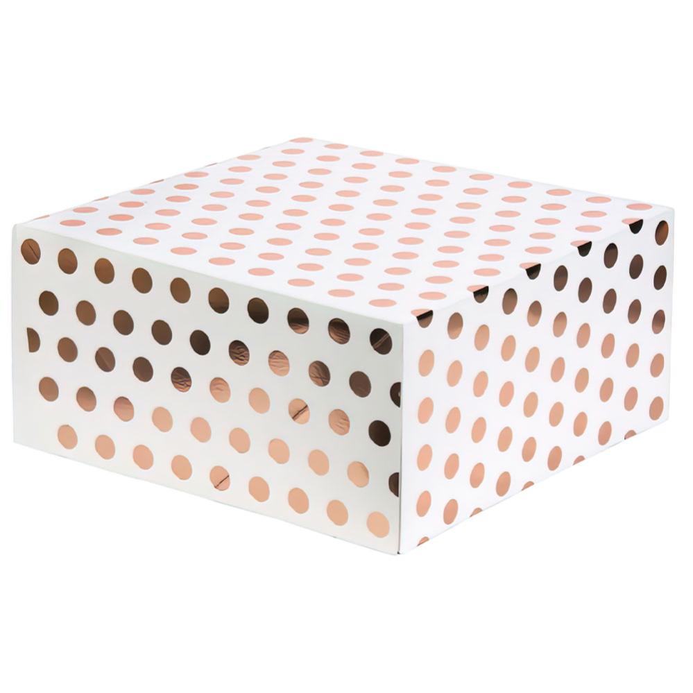 Prickig Tårtkartong Roseguld omfattar en vit tårtkartong av papp med skimrande prickar i roseguld. Kartongen är ca 12,7 cm hög, 26 cm bred och 26 cm djup.