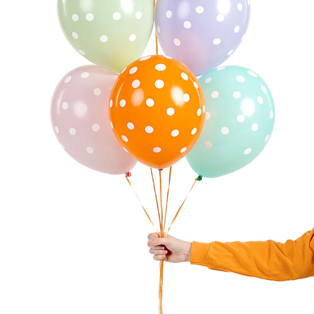 Passa på att dekorera inför påsk och äggjakt med prickiga ballonger i en pastell-mix av rosa, turkos, lila, grön och orange! Dessa latex-ballonger med prickar passar perfekt att ha helium i och blir en fin dekoration i pastell, både hemma och i trädgården på kalas och fest.