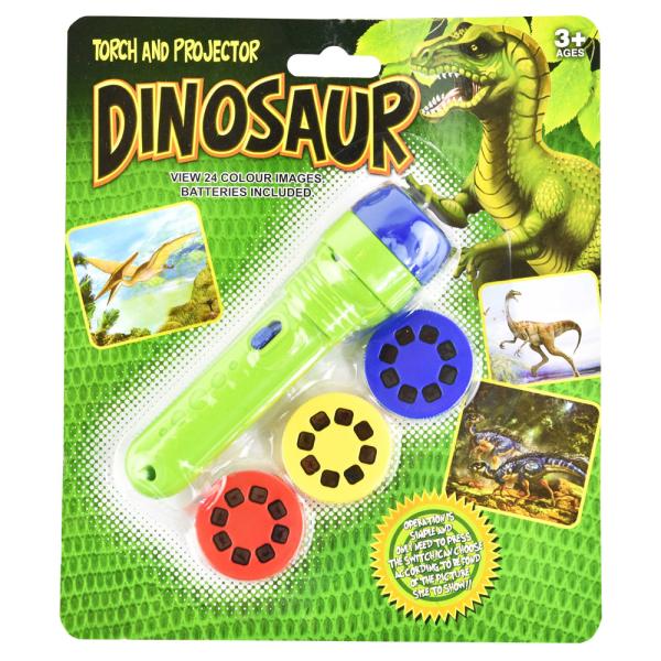 Projektor Ficklampa Dinosaurier omfattar en projektor-ficklampa med 24 olika dinosauriebilder. Projektorn är tillverkad av plast och är ca 11,5 cm stor. Batterier medföljer.