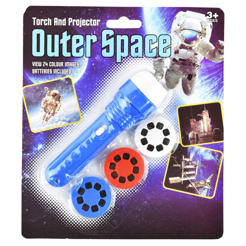 Projektor Ficklampa Rymden omfattar en projektor-ficklampa med 24 olika bilder av rymden, astronauter, rymdskepp m.m. Projektorn är tillverkad av plast och är ca 11,5 cm stor. Batterier medföljer.