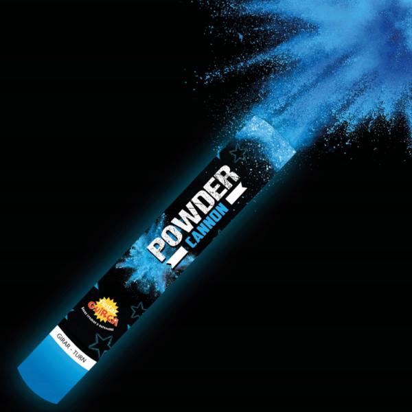 Pulverkanon Blå 30 cm omfattar en pulverkanon som skjuter ut blått pulver med kraftigt lufttryck när kanonens nedre del vrids om.