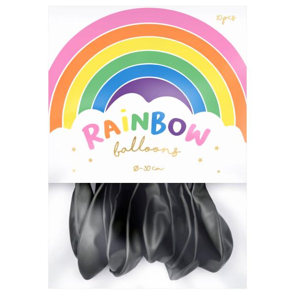 Rainbow Latexballonger Pastell Svarta omfattar 10 stycken pastell svarta latexballonger som mäter ca 30 cm i diameter. Blås upp ballongerna med luft eller helium.