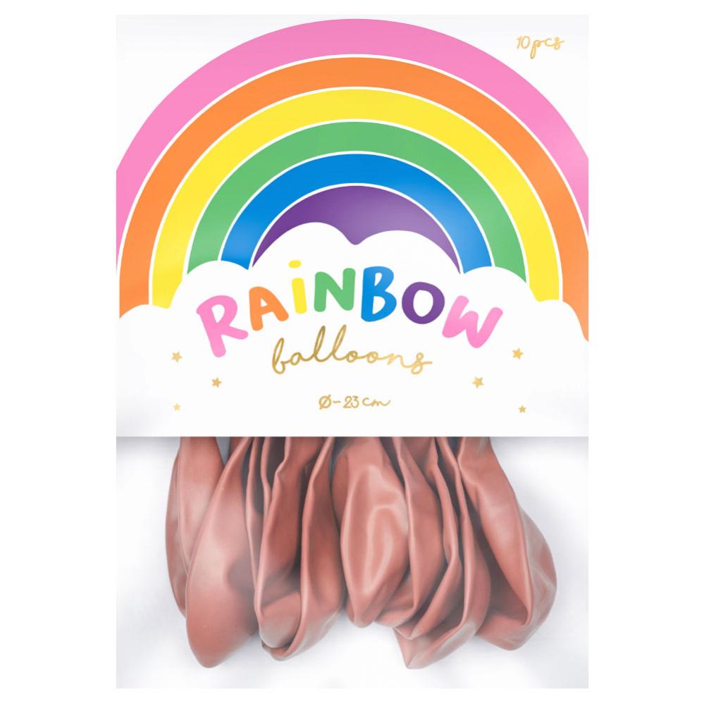 Rainbow Små Latexballonger Metallic Roséguld omfattar 10 stycken metallic roséguldiga latexballonger som mäter ca 23 cm i diameter. Blås upp ballongerna med luft eller helium.
