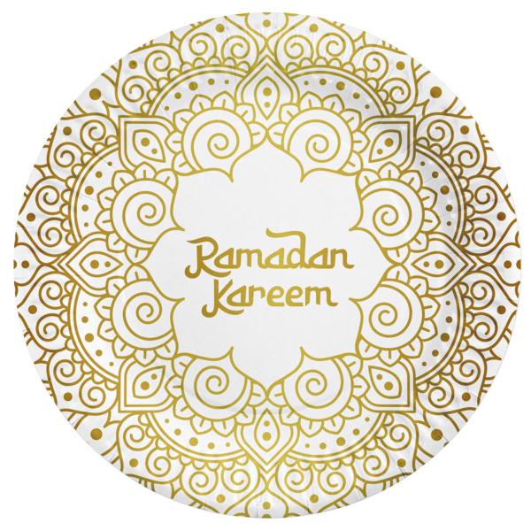 Ramadan Kareem Papperstallrikar 23 cm 8-pack består av åtta vita engångstallrikar som är prydda med ett vackert mönster och texten "Ramadan Kareem" i matt guld.