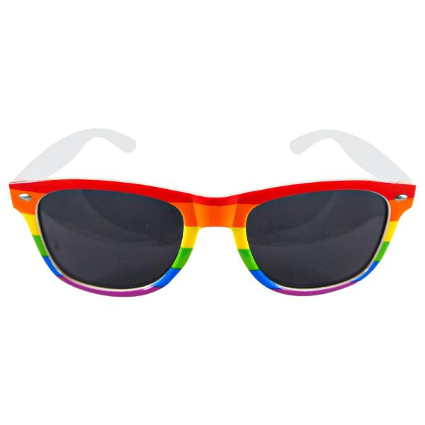 Regnbågsfärgade Solglasögon innehåller ett par solglasögon med mörka glas och regnbågsfärgade bågar. Solglasögonen är tillverkade av plast och passar vuxna.