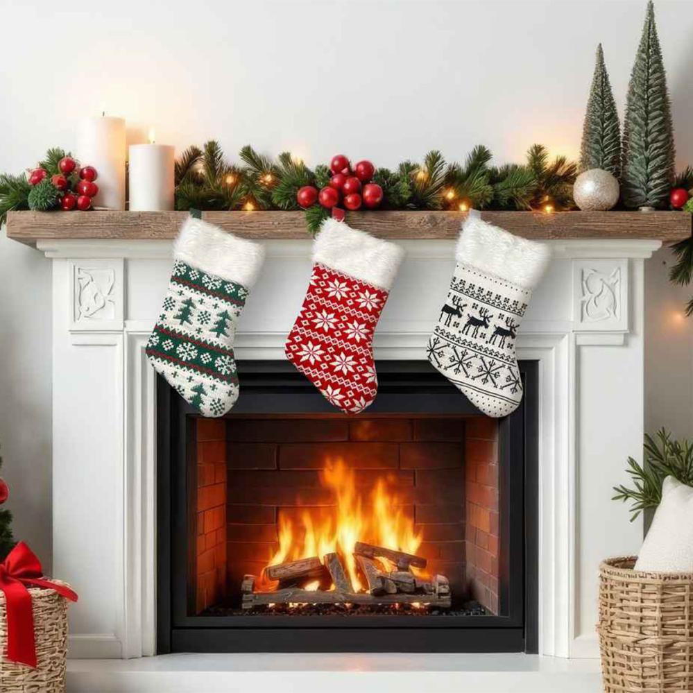 Denna juldekoration ger en lugn känsla vid den öppna spisen och passar fint med vintergrönt, ljusslingor och enkla textilier. Julstrumpan rymmer små paket, godis och kort, kan hängas upp där den passar och är enkel att matcha med övriga färger.