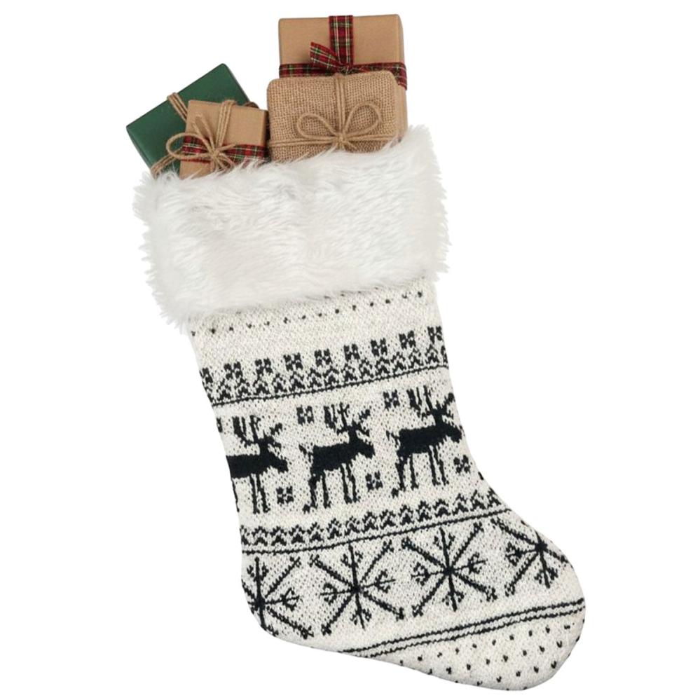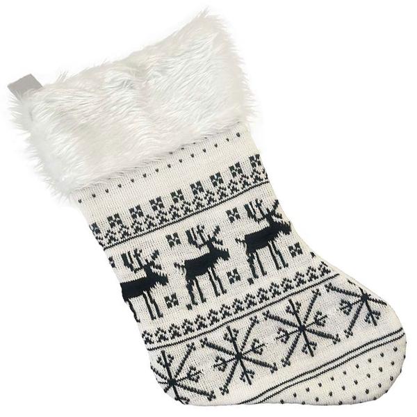 Renar Julstrumpa Svartvit omfattar en vit julstrumpa med pälskant, dekorerad med snöflingor, renar och andra svarta detaljer. Julstrumpan har en vit ögla för upphängning.