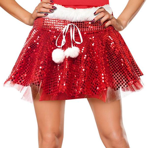 Röd Tyllkjol med Paljetter omfattar en glittrig röd kjol som är dekorerad med röda paljetter och ett vitt snöre med vita bollar i ändarna. Kjolen har ett resårband för en mer anpassad och komfortabel passform.