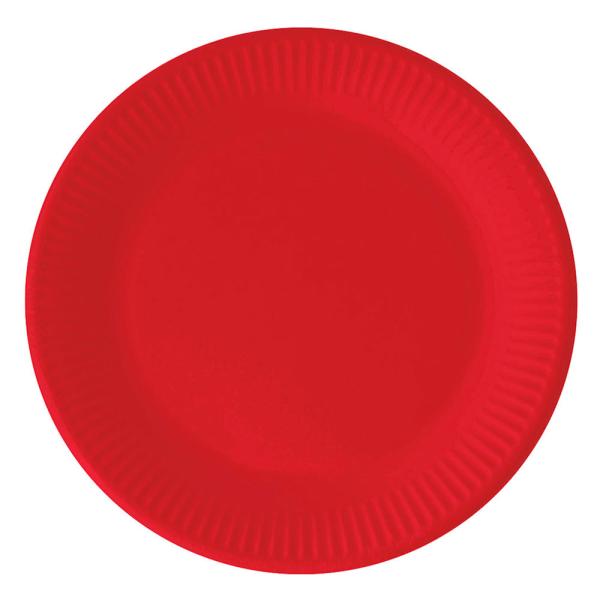Röda Pappassietter Solid Color omfattar röda engångsassietter i papp som mäter ca 19,5 cm i diameter.