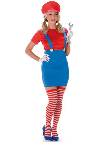 Rörmokare Klänning Maskeraddräkt är en outfit som består av en blå hängselkjol med gula knappar, över en röd t-shirt. Dragkedja finns på sidan av kjolen. För att få denna rörmokare outfit komplett har du även en obligatorisk röd hatt.