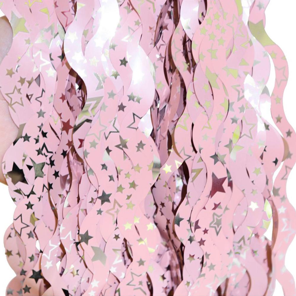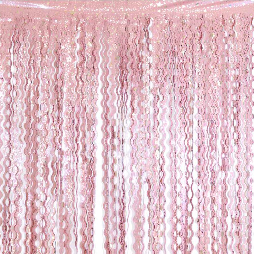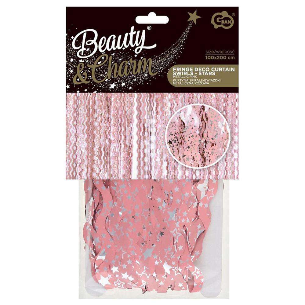 Rosa Dörrdraperi Swirls med Stjärnor omfattar ett dörrdraperi med långa rosa swirls dekorerade med silverfärgade stjärnor.
