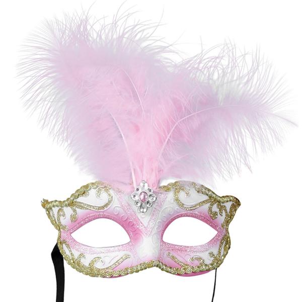 Rosa Halvmask med Fjädrar omfattar en rosa och vit halvmask med vita samt rosa och guldglittrande mönster, rosa fjädrar, en rosa juvel och en vågig, guldfärgad tygrand som sitter längs hela masken. Masken knyts runt huvudet med hjälp av ett svart band för att hålla den på plats.