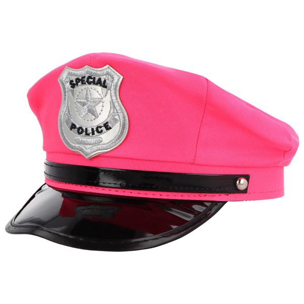 Rosa Polishatt omfattar en polishatt i färgen rosa med en blank svart skärm. Hatten är designad i klassisk kepsmodell och har även en silvrig polisbricka med texten "Special Police" i svart.