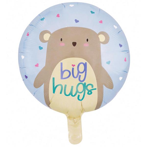 Rund Folieballong Big Hugs 46 cm omfattar en rund, blå folieballong som är dekorerad med små hjärtan i olika färger samt en söt björn med text "big hugs" på magen.
