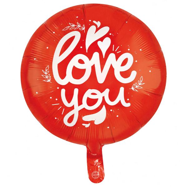 Rund Folieballong Love You 46 cm omfattar en rund, röd folieballong med vitt motiv av hjärtan, blomblad och texten "love you".
