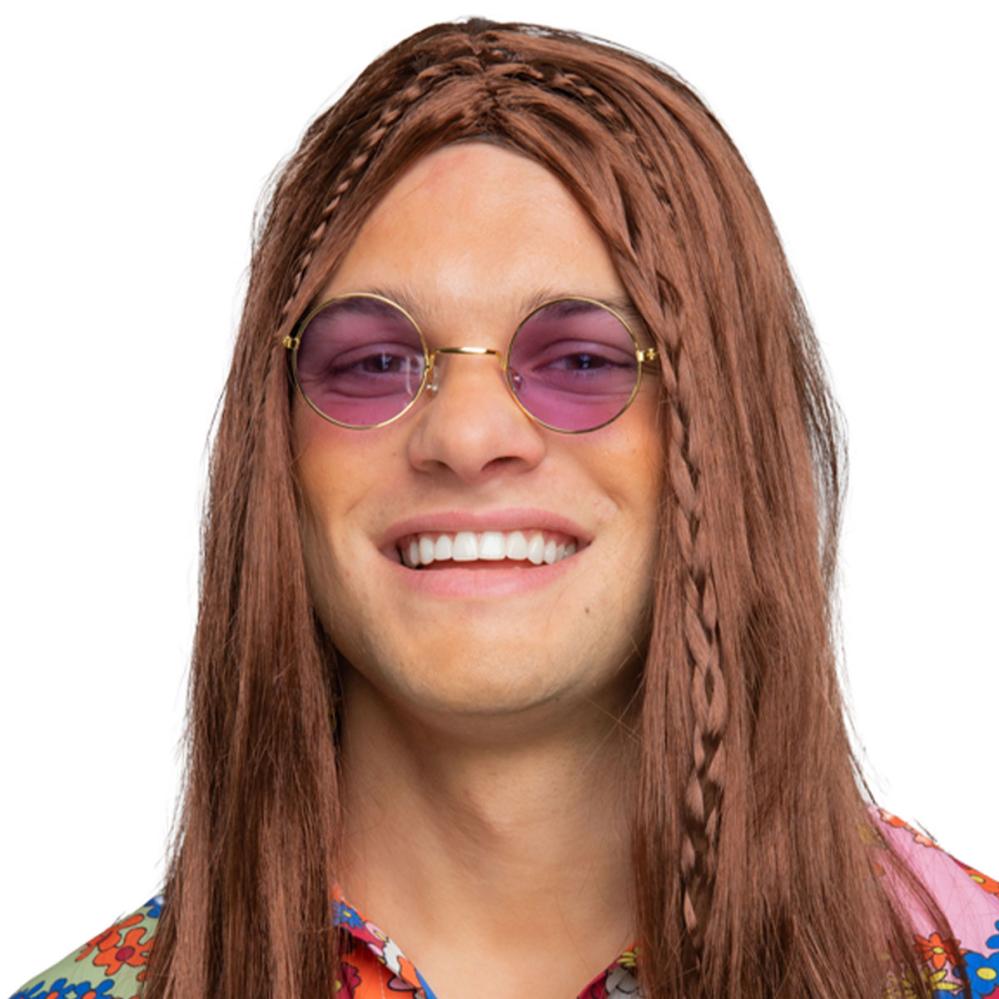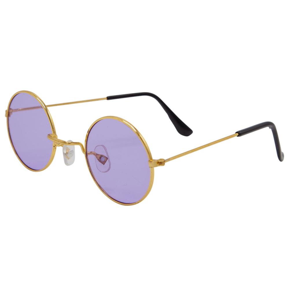 Till maskerad eller fest passar glasögon inspirerade av hippies, med runda lila linser och en guldfärgad båge i plast. Dessa plastglasögon är lätta och kan kombineras med kläder, peruk eller hatt.