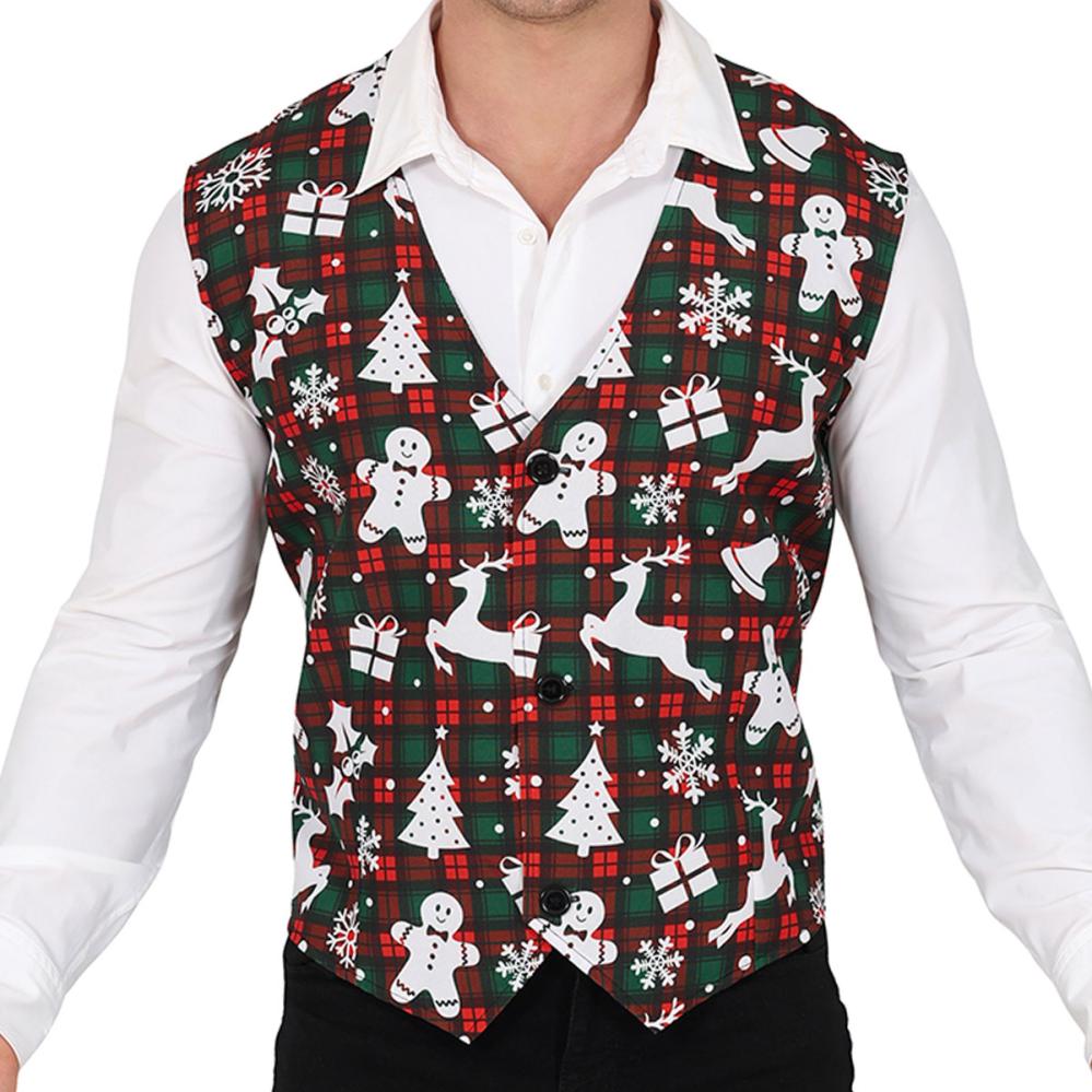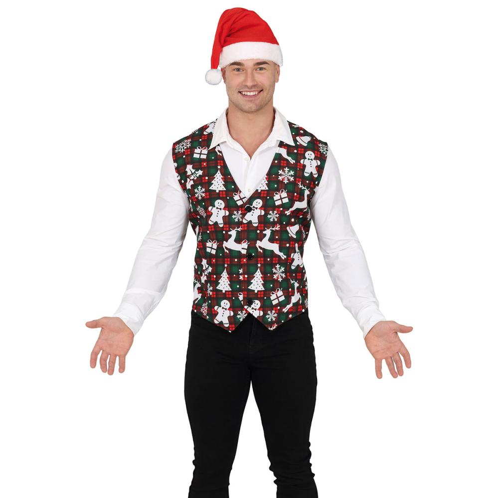 Stick ut under julfirandet med en julig väst som bjuder på klassiska motiv som pepparkaksgubbar och snöflingor. Denna väst med julmotiv är det perfekta valet för dig som söker en stilsäker herrjulväst.