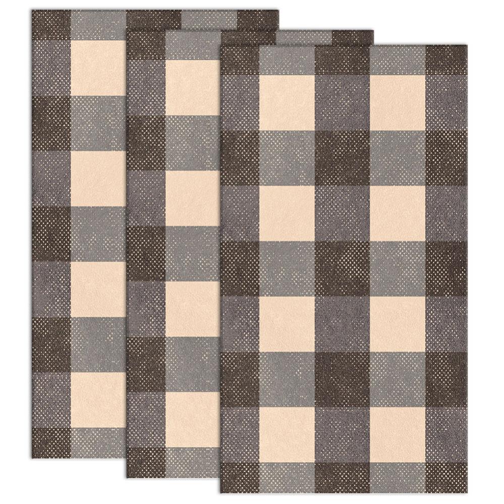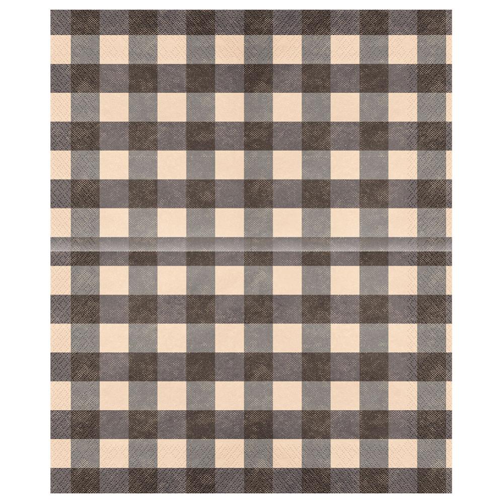 Rutiga Pappersservetter 20-pack består av tjugo rektangulära engångsservetter i två lager med ett rutigt mönster i färgerna svart, grå och beige.