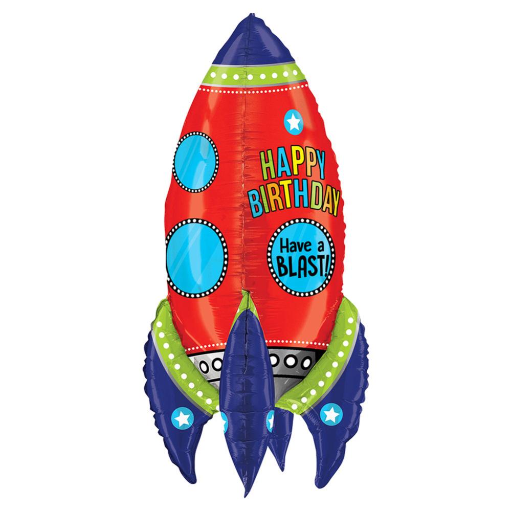Rymdraket Ballong Happy Birthday omfattar en 45 cm stor folieballong i form av röd rymdraket med texterna "Happy Birthday" samt "Have a blast!". Ballongen har självflöslutande ventil och blåses upp med luft eller helium.