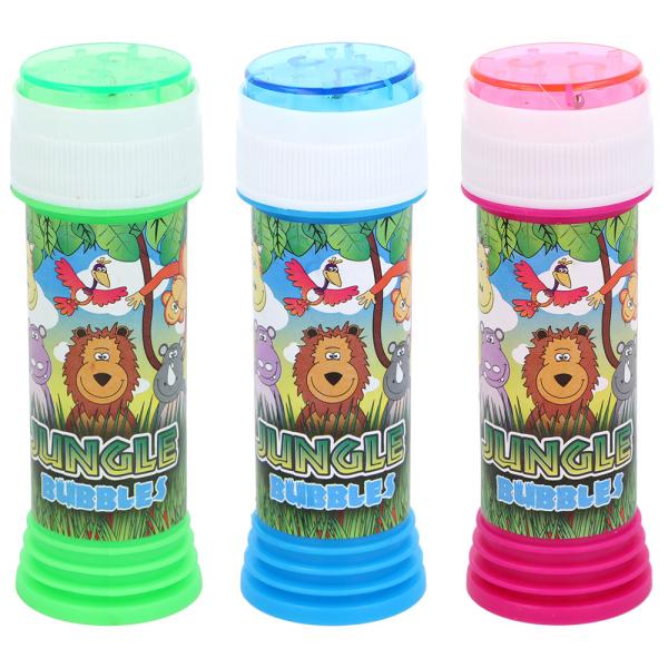 Såpbubblor Djungel 50 ml omfattar en flaska med djungelmotiv, innehållande 50 ml såpbubbelvätska och med ett kulspel i locket.