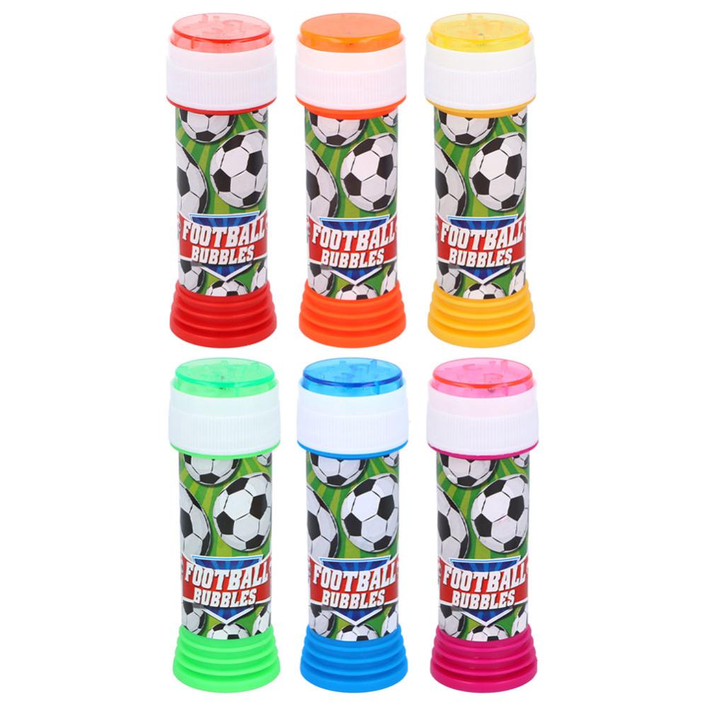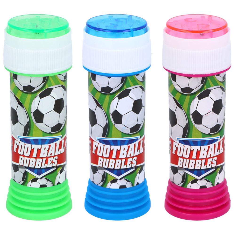 Såpbubblor Fotboll 50 ml omfattar en flaska med fotbollsmotiv, innehållande 50 ml såpbubbelvätska och med ett kulspel i locket.