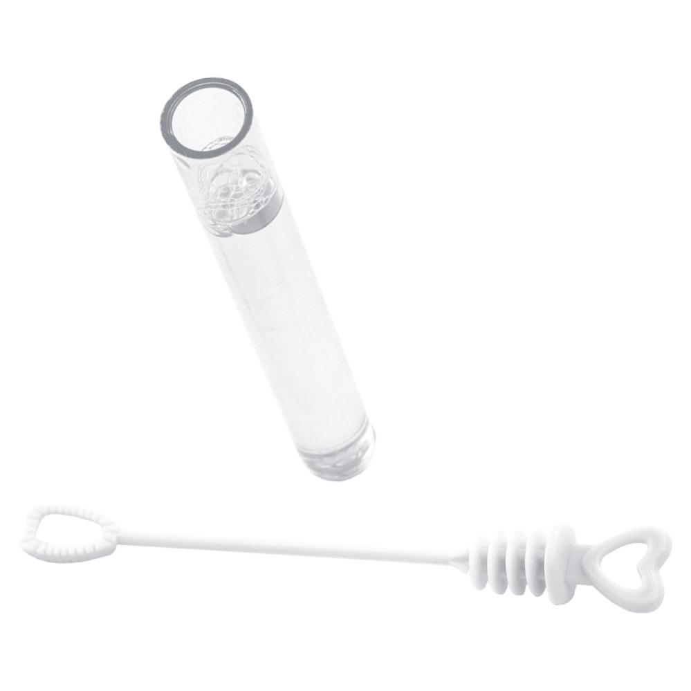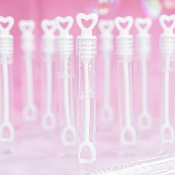 Såpbubblor Hjärtan 48-pack Vit omfattar 48 stycken vita såpbubbelflaskor med sött hjärta. Varje flaska innehåller 4 ml såpbubbelvätska.