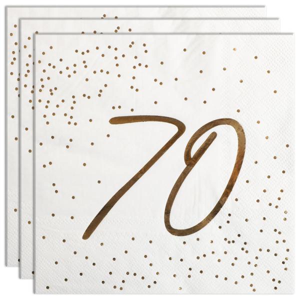 Skapa en stilren dukning på nästa 70-årsfest med dessa servetter som lyfter helheten direkt. I varje 16-pack får du vita trelagers engångsservetter med glänsande guldtryck och prickar. Perfekta födelsedagsservetter med siffra för kalaset.
