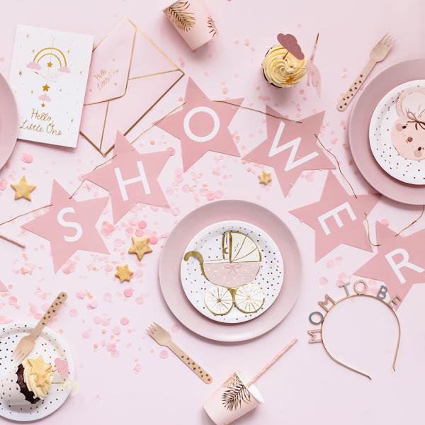Servetter Barnvagn Ljusrosa omfattar ett 20-pack servetter i for av en rosa barnvagn med fina gulddetaljer.
