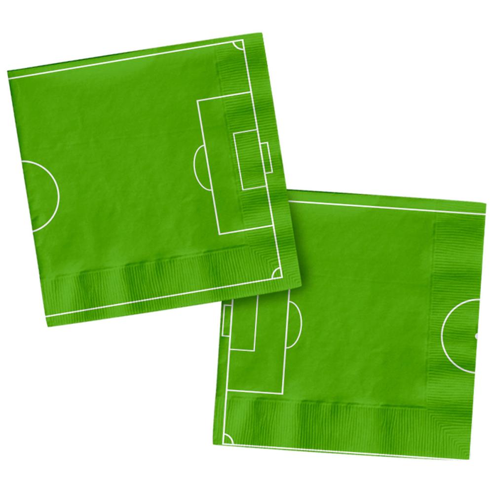 Servetter Fotbollsplan 20-pack består av tjugo ljusgröna pappersservetter med vitt motiv av en klassisk fotbollsplan.