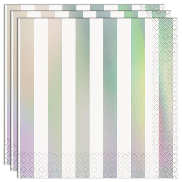 Till alla som älskar holografiska detaljer, så är dessa servetter verkligen perfekta! Dessa servetter dekoreras med flera ränder av holografisk folie, vilket gör att ränderna skimrar i regnbågens alla färger. Holografiska dekorationer är väldigt roliga att dekorera med och kan komplimetteras med flera andra olika roliga detaljer.