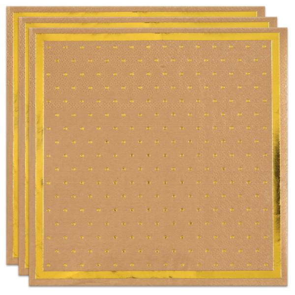 Servetter Prickar Brun och Guld omfattar ett 20-pack bruna servetter med guldig ram samt guldiga prickar. Servetterna mäter ca 33 x 33 cm stora utvikta.