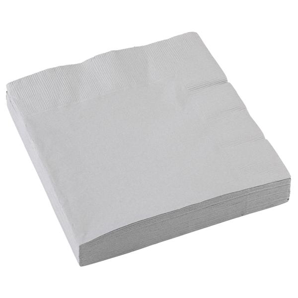 Servetter Silver omfattar 20 stycken servetter med två lager papper i matt silvergrå färg. Servetterna är ca 33 x 33 cm utvikta.