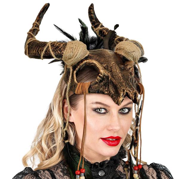 Shaman Oxe Skalle Mask omfattar en brun halvmask i form av en oxeskalle med svarta fjädrar, bruna rep och pärlor. Masken har hål för ögon och ett svart elastiskt band som håller den på plats.