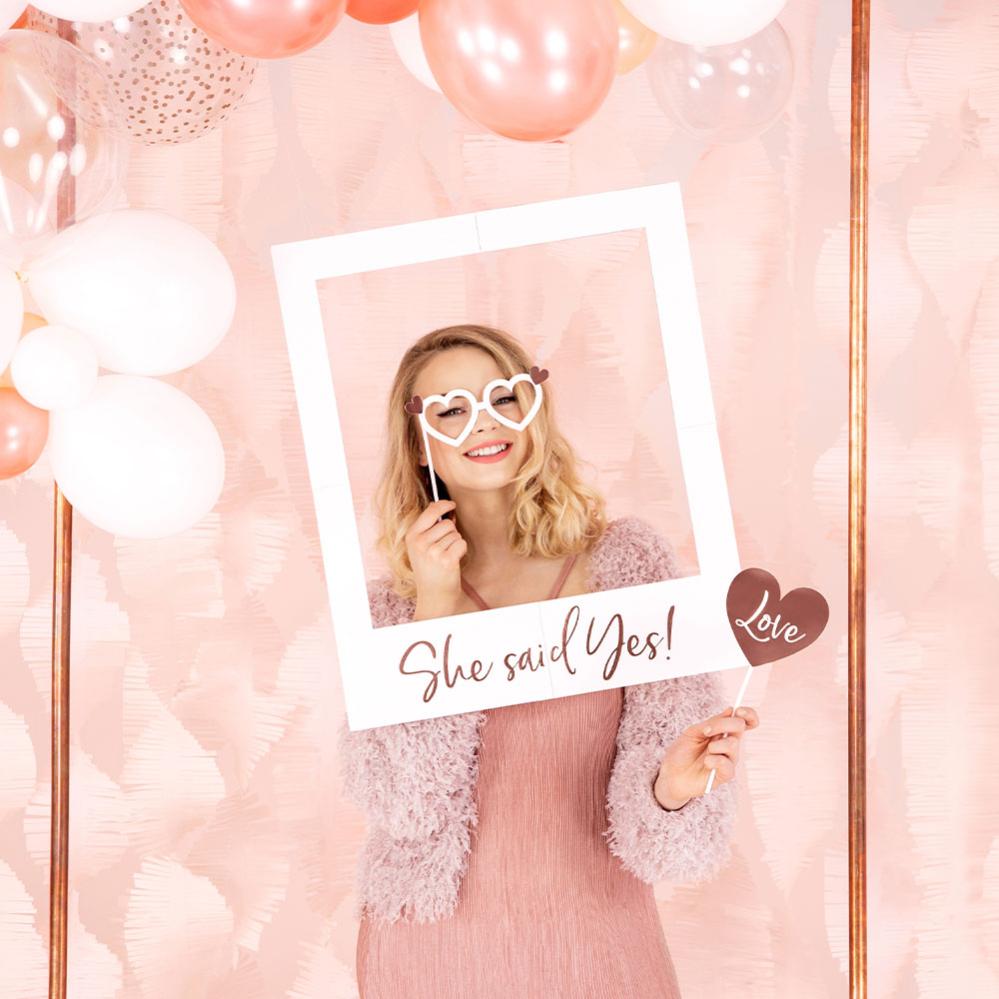 She Said Yes Möhippa Fotoram omfattar en vit fotoram med texten "She Said Yes!" i roséguld. Ramen är tillverkad av papp och är ca 59,5 cm hög samt 50 cm bred.