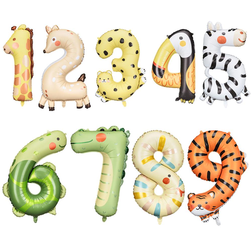 Sifferballong Djungeldjur omfattar nio olika stora sifferballonger i folie med olika djurmotiv. För upphängning har folieballongerna ögla upptill för luft och nedtill för helium. Inkluderar sugrör för uppblåsning.