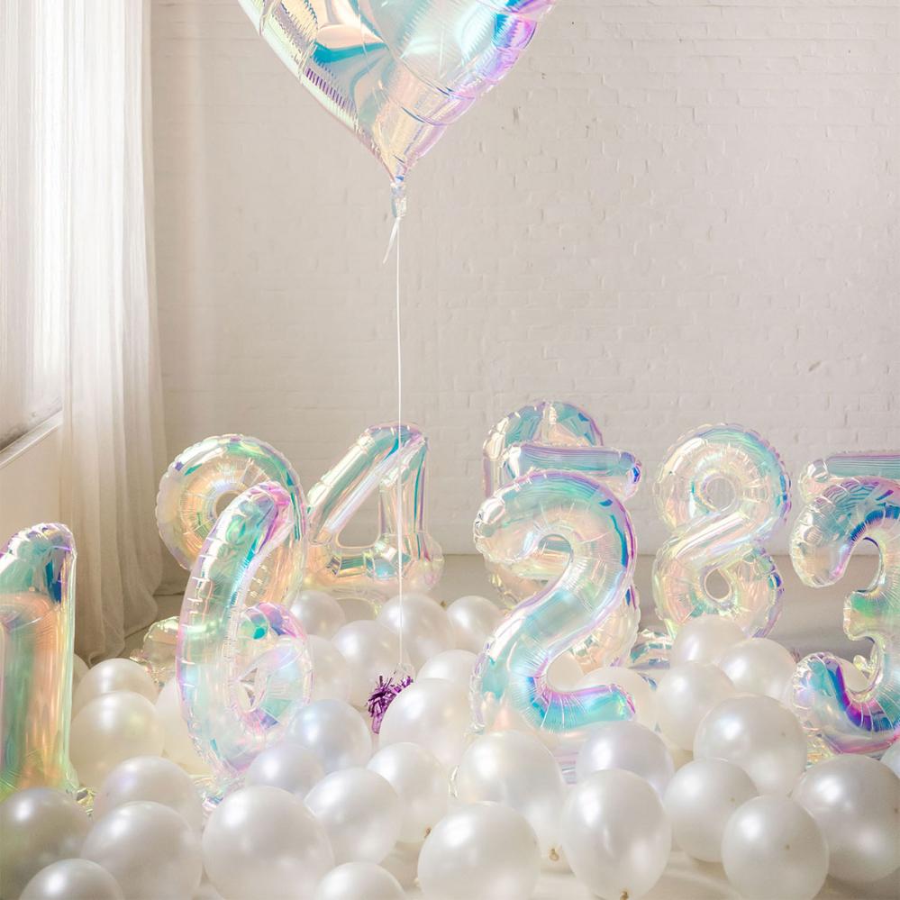 En sifferballong med regnbågsskimmer gör entré med glimten i ögat. Som självstående folieballong blir den ett lekfullt blickfång bland födelsedagens ballonger och siffror.