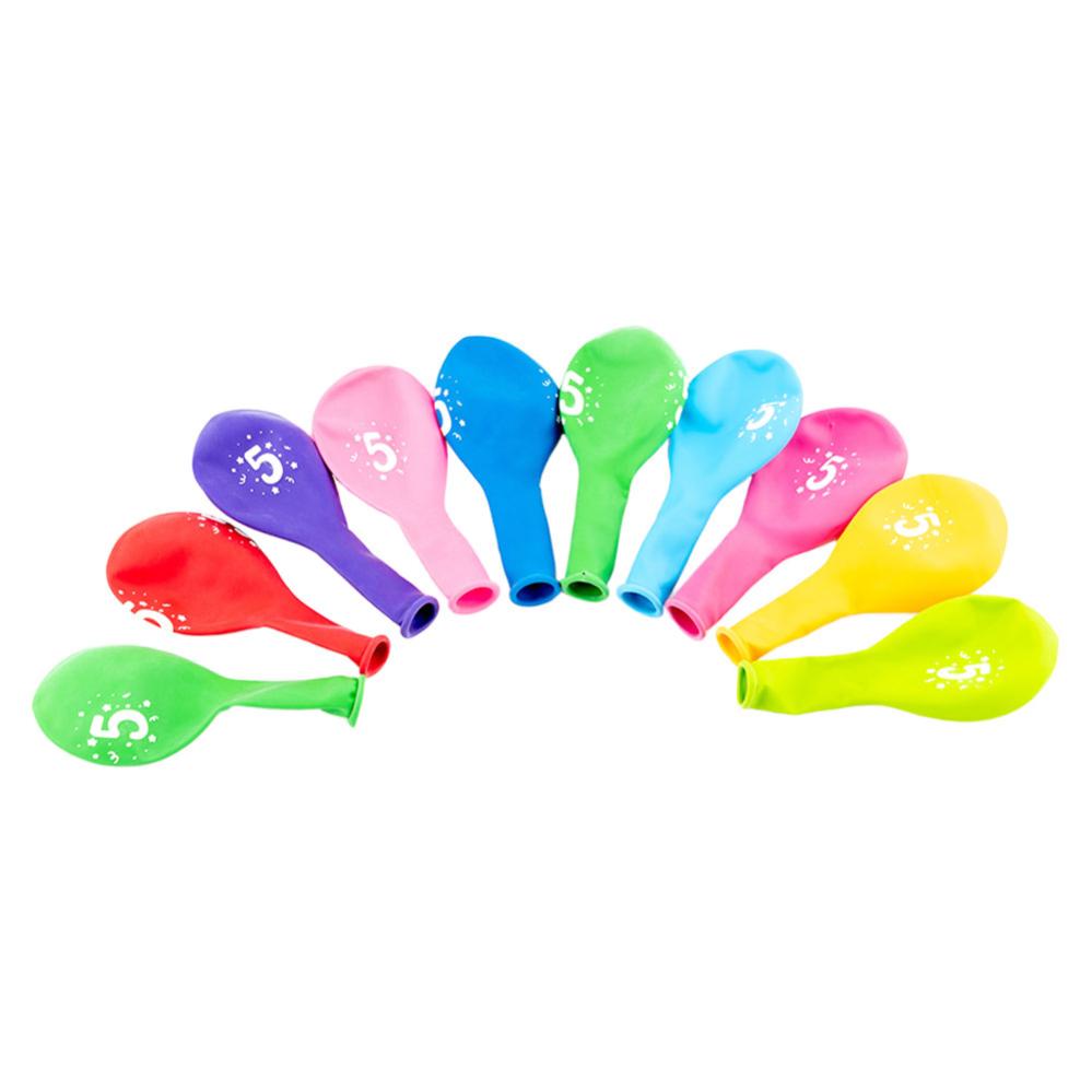 Sifferballonger 5 Olika Färger omfattar ett 10-pack 5-års ballonger i olika glada färger. Latexballongerna fylls med luft eller helium och blir ca 30 cm stora.