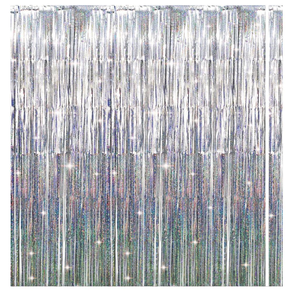 Dörrdraperiet i silver ger en stilren entré till hallen eller festen. Det kan hängas upp med tejp eller små krokar, klippas till rätt längd och sparas för återanvändning som enkel bakgrund i en fotohörna eller som avskärmning.