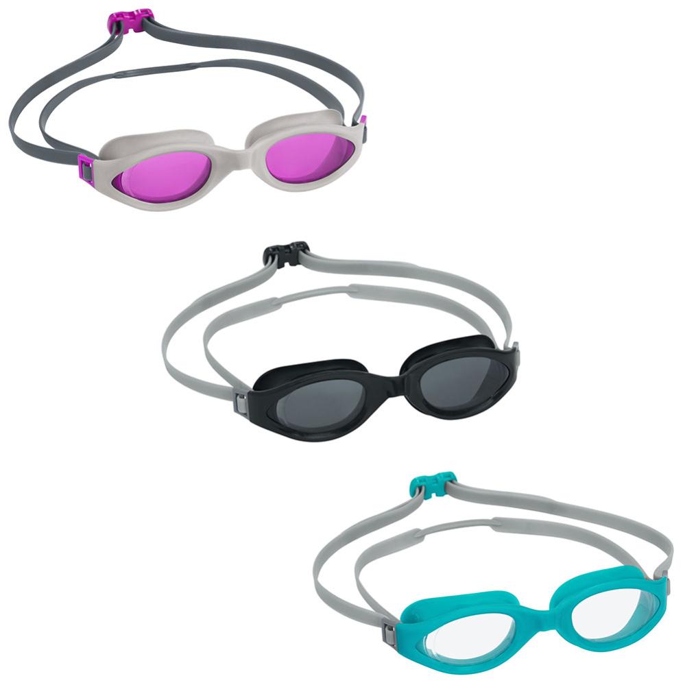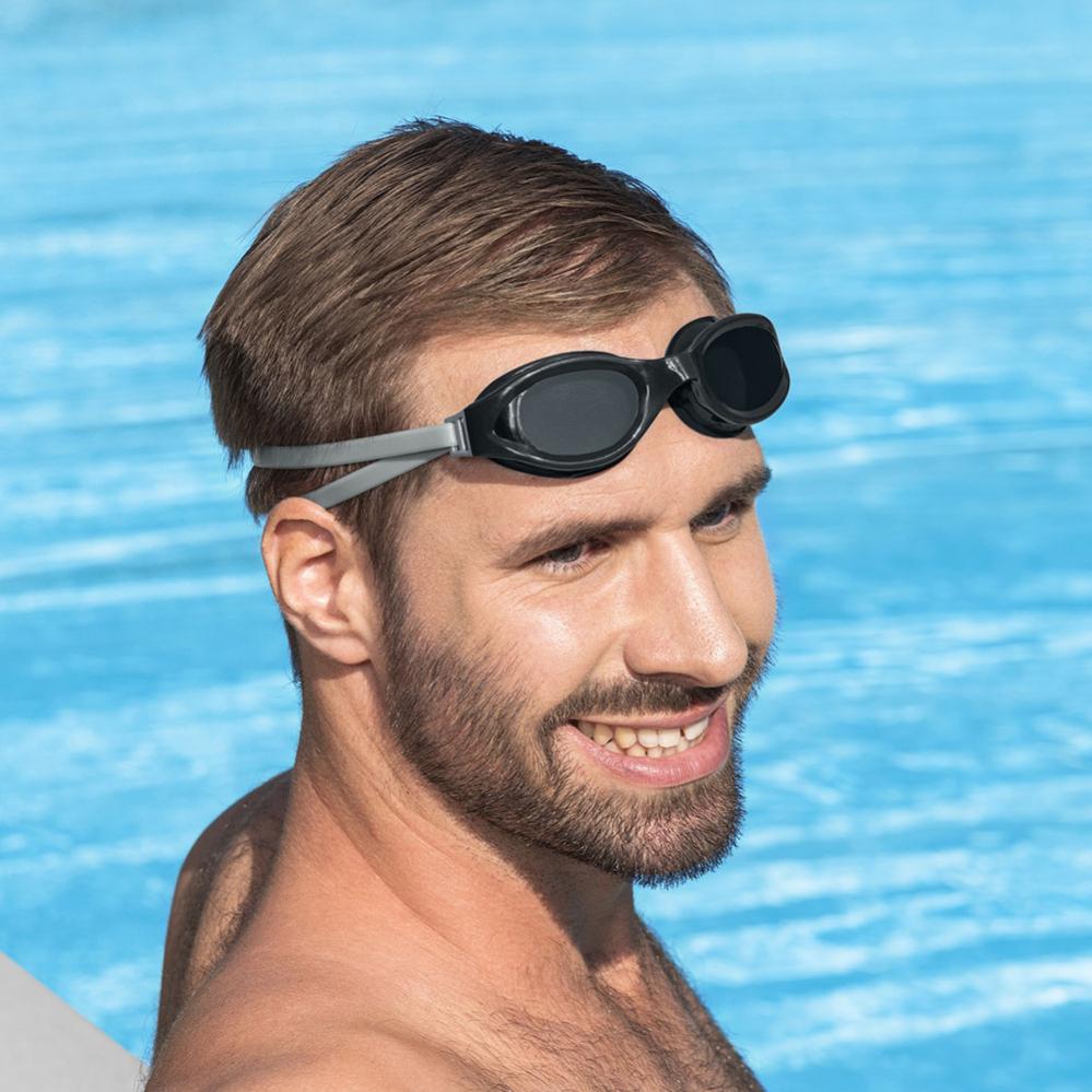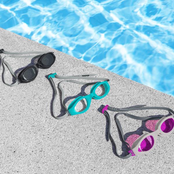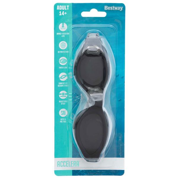 Simglasögon Accelera består av simglasögon passande för vuxna och äldre barn. Linserna är slitstarka, tonade och har en UV-beläggning samt justerbart och bekvämt huvudband av silikon.