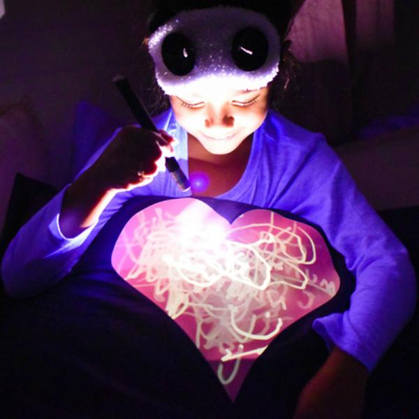 Självlysande Kuddfodral Hjärta omfattar ett lila kuddfodral med hjärtmotiv som man kan rita på med UV-ljus. Använd den medföljande UV-lampan för att skriva texter och skapa egna designs. Varje text och design håller upp till 5 minuter innan den långsamt försvinner. Du kan även skapa skuggeffekter genom att rita över ett objekt eller stencil.
