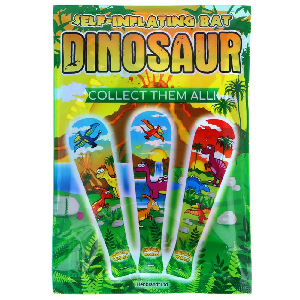 Självuppblåsande Basebollträ Dinosaurie är ett basebollträ som blåser upp sig självt och har ett färgglatt motiv av dinosaurier. Vik ut produkten helt, bryt bubblan inuti den, skaka kraftigt och se den blåsas upp. Den finns i tre olika motiv som säljs osorterade och styckvis, så det blir en överraskning vilket motiv du får.