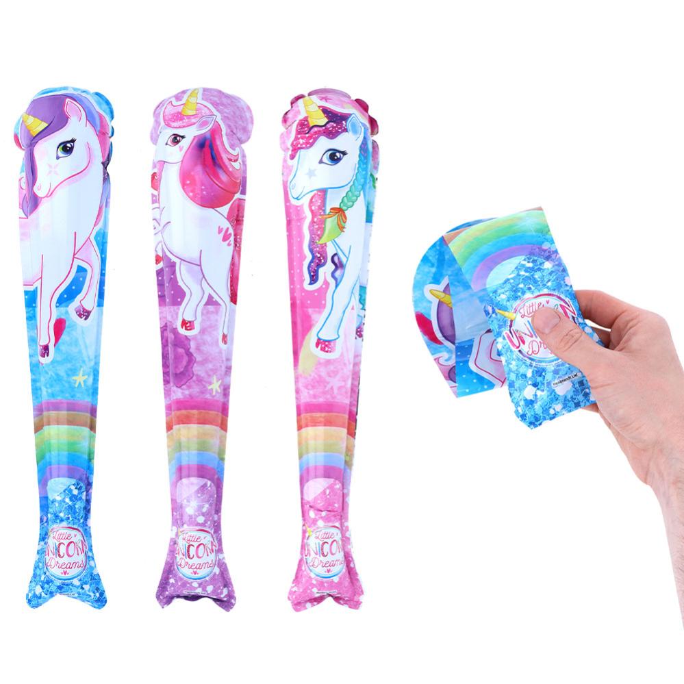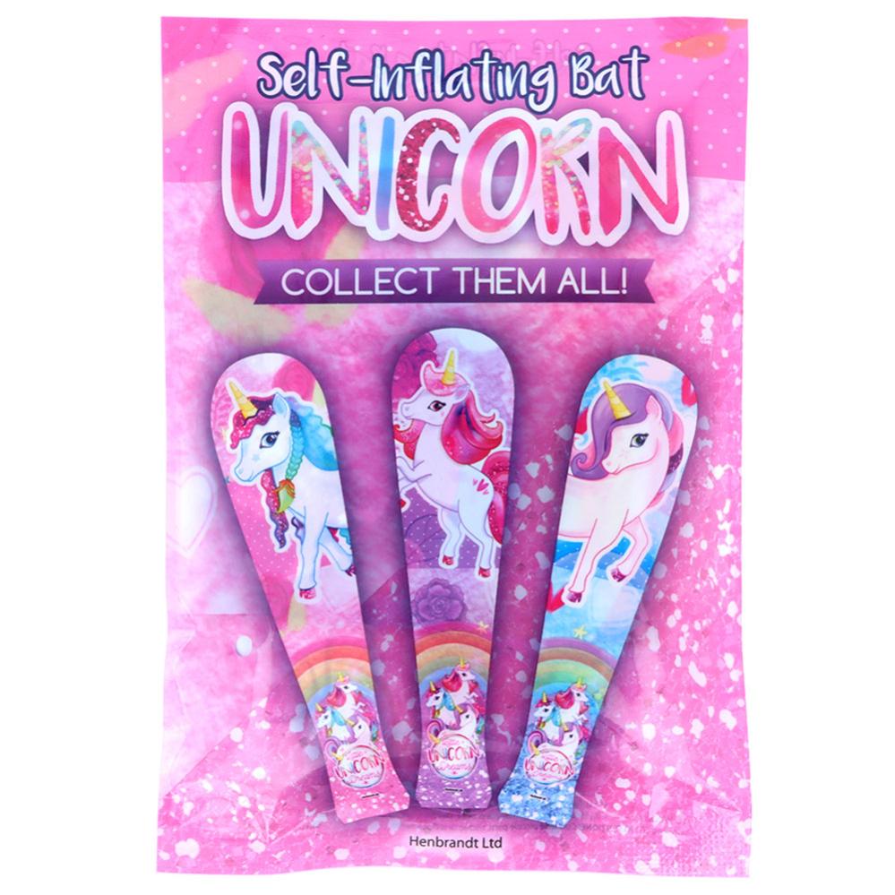 Självuppblåsande Basebollträ Enhörning omfattar ett baseballträ som blåser upp sig själv och har ett färgglatt motiv av enhörningar. Vik ut produkten helt, bryt bubblan inuti den, skaka kraftigt och se den blåsas upp. Den finns i tre olika motiv men de säljs osorterade och styckvis så det blir en överraskning vilket motiv du får.