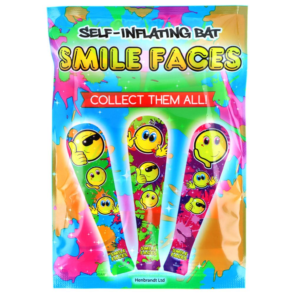 Självuppblåsande Basebollträ Smiley är ett basebollträ som blåser upp sig själv och har ett färgglatt motiv med smileyfigurer. Vik ut produkten helt, bryt bubblan inuti den, skaka kraftigt och se den blåsas upp. Produkten finns i tre olika motiv, men motiven säljs osorterade och styckvis, så det blir en överraskning vilket motiv du får.