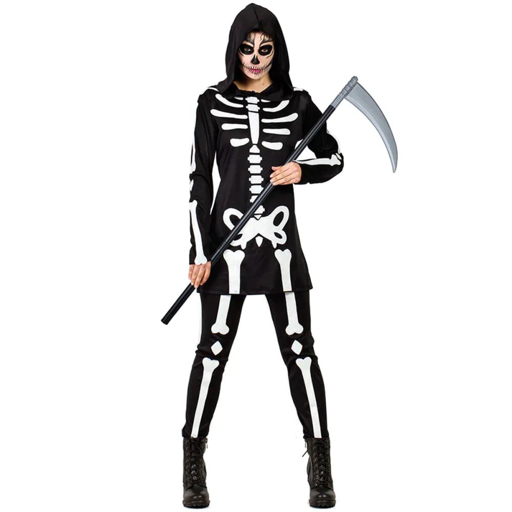 Skelettdräkt med Luva omfattar en lång tröja med luva och långa ärmar samt ett par byxor i svart och vitt.