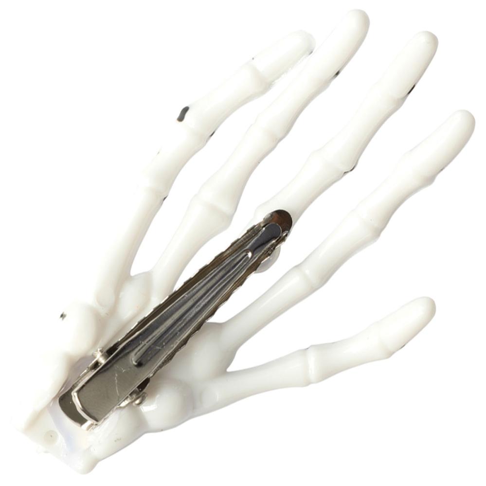 Skeletthand Hårspänne omfattar ett hårspänne prytt med en vit skeletthand med svarta detaljer.