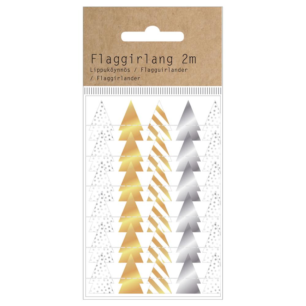 Skimrande Presentband Julgranar 2 m omfattar ett presentband i form av en girlang med små julgranar i skimrande guld och silver på en vit tråd.