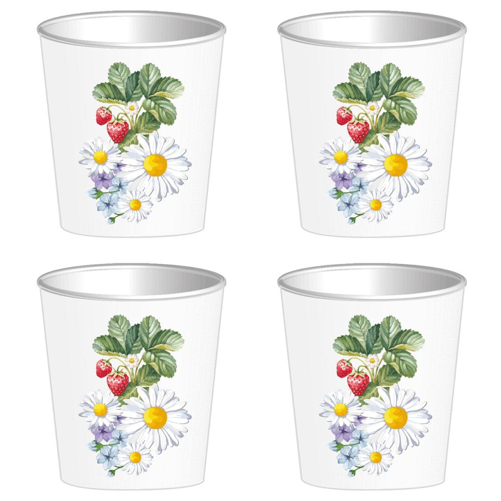 Snapsmuggar Blommor 59 ml 8-pack består av åtta vita pappersmuggar för snaps som är dekorerade med ett färgglatt motiv av jordgubbsplantor och andra vilda sommarblommor.
