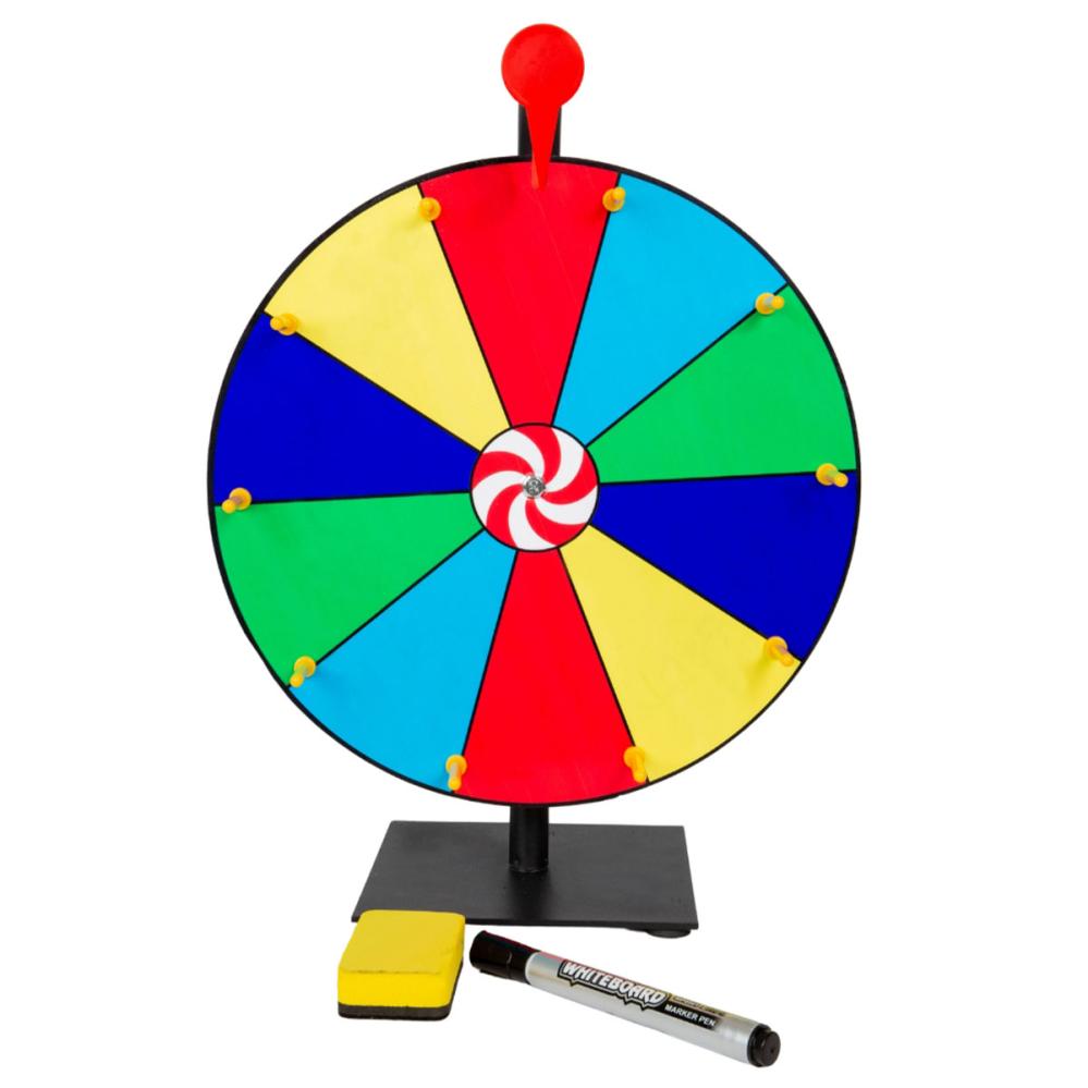 Snurrhjul Flerfärgad 3-pack omfattar tre snurrhjul med tolv fält i rött, blått, grönt, lila och gult, att skriva eller rita på med den medföljande svarta whiteboardpennan och det medföljande suddblocket.