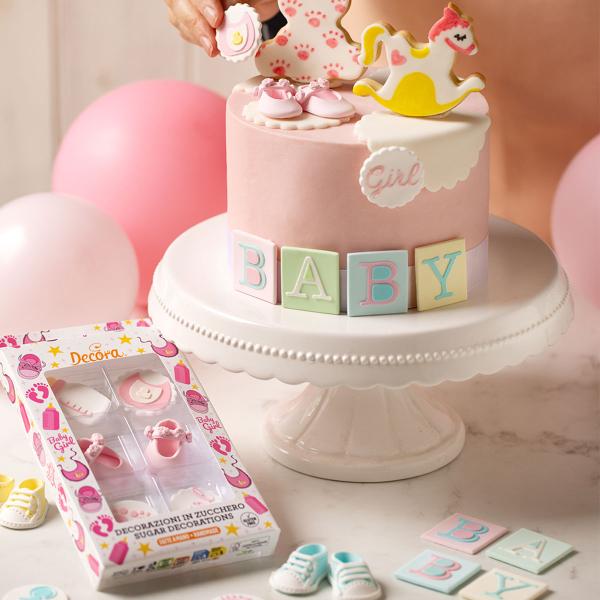 Sockerdekorationer Baby Shower Färgmix 6-pack består av sex ätbara sockerdekorationer i form av två babyskor i vitt och gult samt fyra bokstäver som bildar ordet "BABY" i pastellnyanser av rosa, gult, grönblått, vitt och grönt.